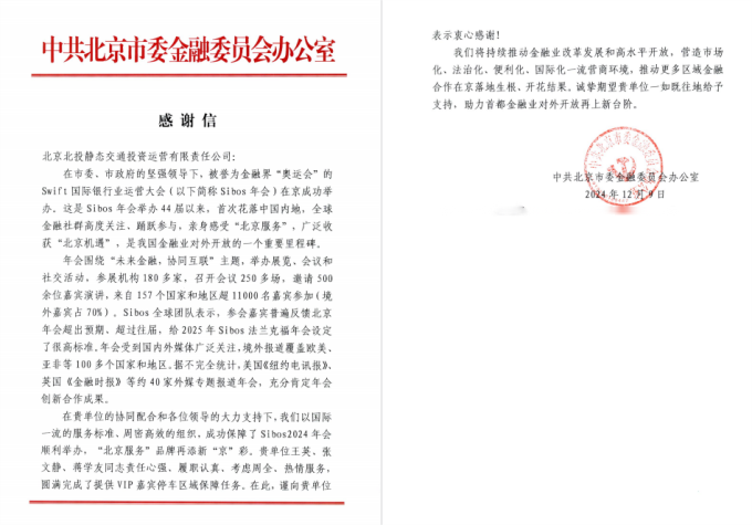 同時,近段時間以來,北投靜態交通公司圓滿完成2024年中國國際服務貿易交易會、中國-非洲-聯合國教科文組織教育和文化遺產保護合作對話會、Sibos年會、第35屆北京農民藝術節“鄉村大舞臺”優秀節目匯演等重要活動停車保障,先后收到中國聯合國教科文組織全國委員會秘書處、中共北京市委金融委員會辦公室、北京市農業農村宣傳中心等單位送來的感謝信,對公司提供的專業停車保障表示感謝。