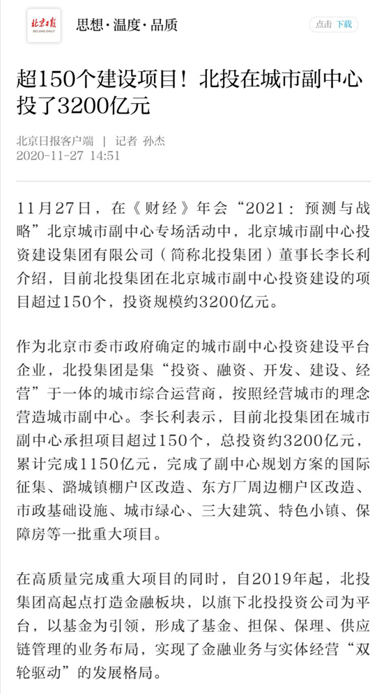 目前,北投集團(tuán)在城市副中心承擔(dān)項(xiàng)目超過150個(gè),總投資約3200億元,完成了副中心規(guī)劃方案的國(guó)際征集、潞城鎮(zhèn)棚戶區(qū)改造、東方廠周邊棚戶區(qū)改造、市政基礎(chǔ)設(shè)施、城市綠心、三大建筑、特色小鎮(zhèn)、保障房等一批重大項(xiàng)目。